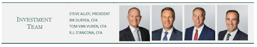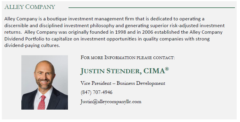 The investment philosophy of the Alley Company Dividend Portfolio focuses on striking the balance between attractive absolute dividend yield and strong dividend growth underpinned by solid company fundamentals of our portfolio holdings. We employ a bottom-up, research-driven process focused on fundamental analysis of our portfolio holdings.