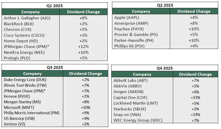 Dividend announcements among Alley Company Dividend Portfolio holdings during the calendar year are below: