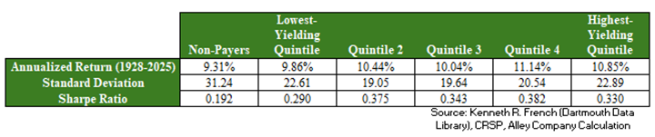 For nearly a century, such stocks have delivered relatively outsized gains and a smoother ride. The below table depicts the range of performance for dividend-paying U.S. stocks broken out into five buckets (from those yielding the most to those yielding the least), plus an additional bucket for non-dividend paying U.S. stocks. The data show that from 1928 through 2025, the second-highest yielding group of companies produced the best absolute return and with comparatively lower volatility, as measured by standard deviation. This resulted in the highest Sharpe ratio, a risk-adjusted performance metric, for the group.