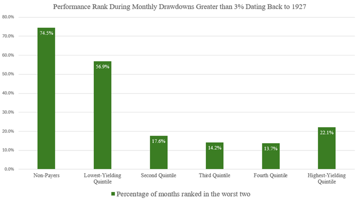 Part of this superior risk-adjusted performance came from the cohort’s tendency to hold up better during market selloffs. In the graph below, we ranked the percentage of months that each aforementioned cohort placed as one of the worst two performers amongst the group during months when the broad market fell more than three percent. Once again, the second highest-yielding quintile was best-in-show. At the same time, those companies that paid no dividend, or paid a relatively low dividend, consistently ranked near the bottom. It is also noteworthy that the highest-yielding group often stacked up poorly during months of market stress, proving that there is risk when reaching for yield.