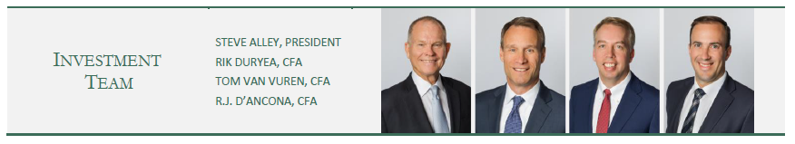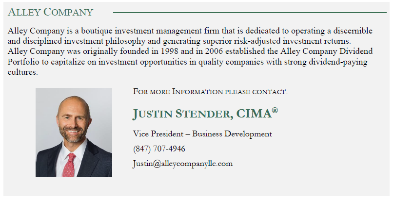 The investment philosophy of the Alley Company Dividend Portfolio focuses on striking the balance between attractive absolute dividend yield and strong dividend growth underpinned by solid company fundamentals of our portfolio holdings. We employ a bottom-up, research-driven process focused on fundamental analysis of our portfolio holdings.