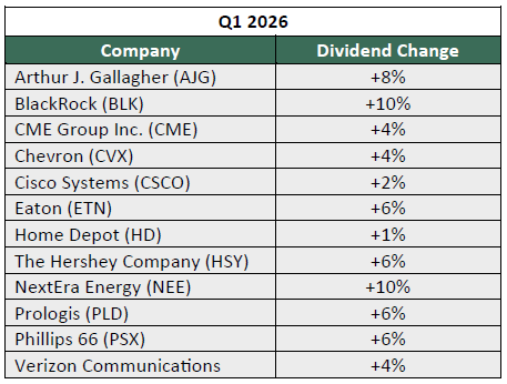 Dividend announcements among Alley Company Dividend Portfolio holdings during the calendar year are below: