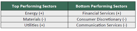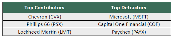 Top and bottom performing sectors in the Russell 1000 Value Index during the quarter are displayed in the table below. (+) and (-) symbols indicate the Alley Company Dividend Portfolio being overweight or underweight the sector relative to the benchmark weighting. Lack of exposure to the Materials sector, which is comprised primarily of commodity-oriented businesses, weighed on results. An overweight to the Financial Services sector detracted from performance, as well. The strategy’s tilt toward Energy and Utilities sectors benefitted performance. To review, our sector weightings are driven by our bottom-up fundamental research process.