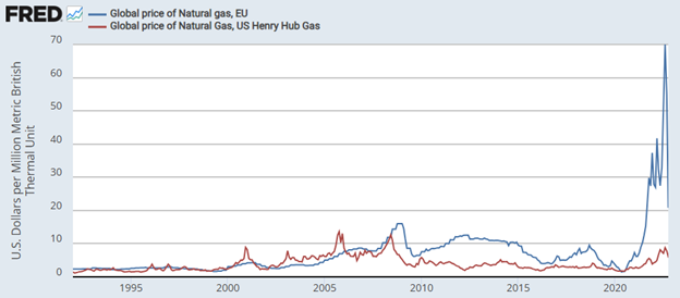 Conversely, increased U.S. production of natural gas has translated to relatively lower domestic natural gas prices and more insulation on this front. Dating back to the early 1990s, the below chart shows the price of natural gas in the European Union (blue line) and the United States (red line). Prices between the two regions were fairly tight through 2008, after which, ramping U.S. supply drove the price down compared to the EU. The 2022 Russian invasion of Ukraine unleashed an even starker contrast, when the EU price of natural gas touched $70 per million metric British thermal units (MMBtu) while U.S. natural gas remained below $10 per MMBtu. Though, the latter’s exposure to global natural gas markets still led to a rise in price.