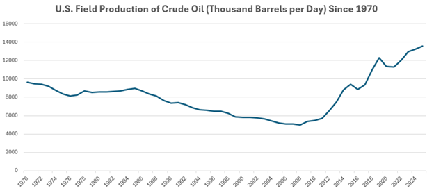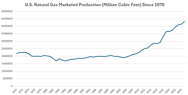 In the 1970s, U.S. oil production faced a steady decline and the specter of “Peak Oil” (i.e., the point at which global oil production hits its maximum level and begins an irreversible decline) permeated energy markets. However, innovation within the oil industry beat back this threat as decades of experimentation led to breakthroughs around the turn of the century. In the early 2000s, energy companies began in earnest to combine hydraulic fracturing with horizontal drilling into shale rock formations. This advancement laid the groundwork for reversing the decline in U.S. oil production and simultaneously driving a tremendous spike in U.S. production of natural gas, as the two charts below depict.